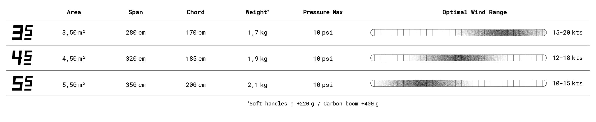 3 tailles complémentaires pour couvrir toutes les conditions : 3.5, 4.5 et 5.5 m².